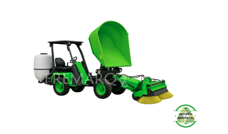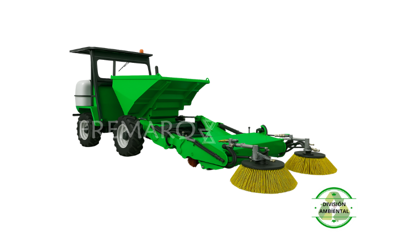 DUMPER Barredora Vial Autocargable, un equipo robusto y eficiente para limpieza urbana e industrial, cuenta con tracción 4×4 y motor KOHLER de 25,5 C.V. con refrigeración por agua, descarga hidráulica giratoria y dirección hidráulica para mayor maniobrabilidad. Incorpora tres cepillos barredores flotantes y regulables, sistema de agua pulverizada y posibilidad de integrar accesorios como retro o mástil de carretilla, su diseño asegura seguridad y comodidad gracias a cabina protegida, parabrisas con limpiaparabrisas, luces reglamentarias, avisador acústico y cinturón de seguridad.